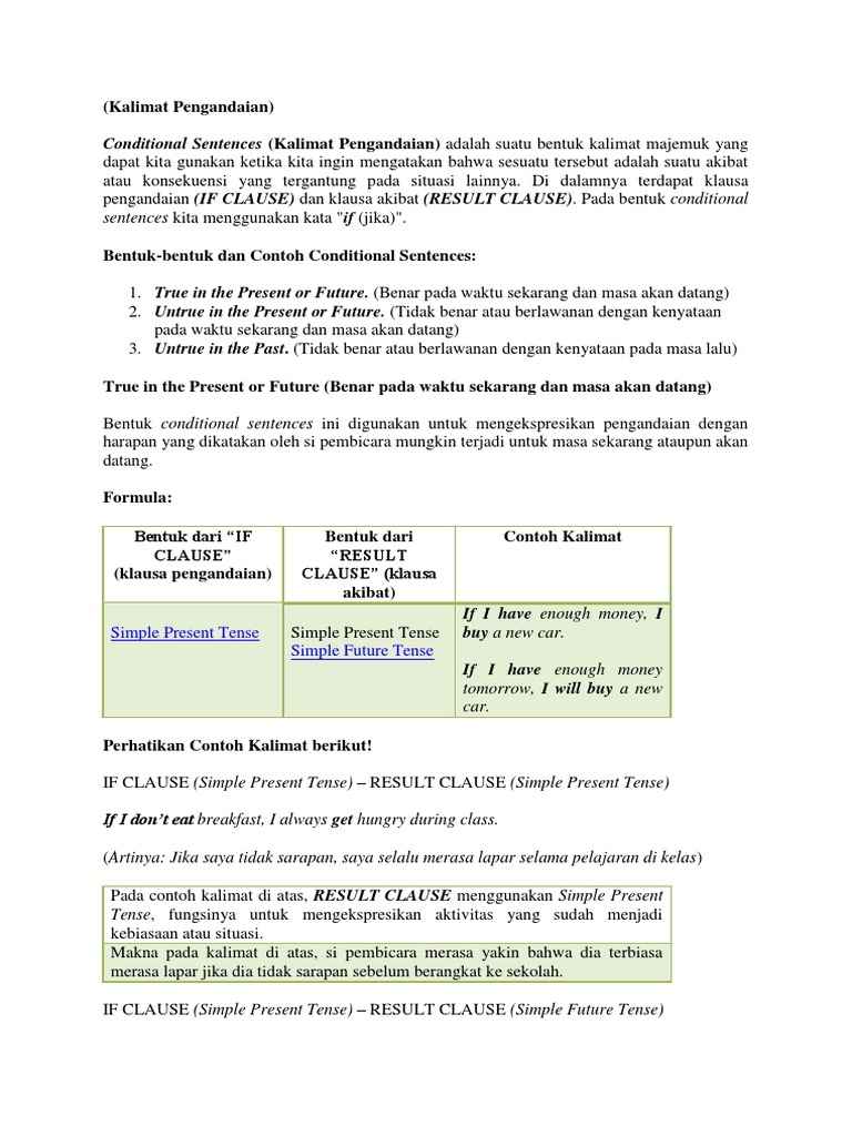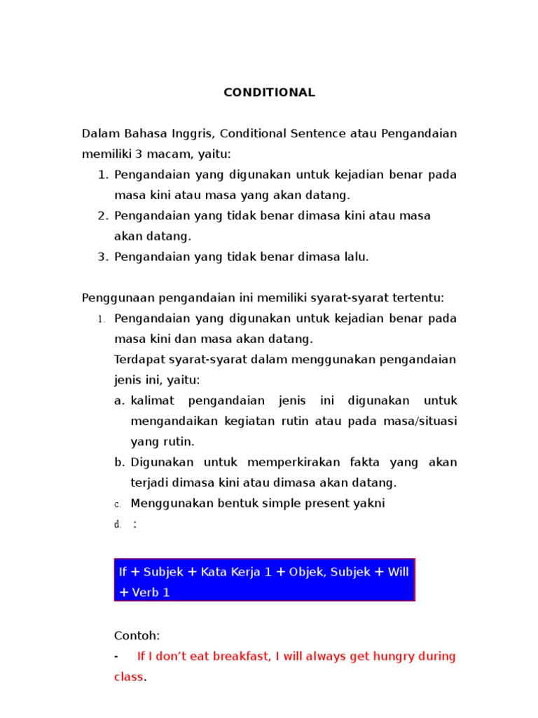 Conditional Sentences from imgv2-1-f.scribdassets.com Pengertian dan contoh conditional sentence dalam bahasa inggris super lengkap. 10 contoh kalimat penutup pidato dalam bahasa inggris. Home » bahasa inggris » kalimat pengandaian dalam bahasa inggris: Berdasarkan pembagian waktunya, tenses didalam tata bahasa inggris dibagi menjadi 3,yaitu: Semua tenses dalam bahasa inggris sangat mudah dipahami ketika kita tahu kapan menggunakannya. Pada dasarnya semua kalimat pengandaian dalam bahasa inggris merupakan kalimat komplek, kalimat ini terdiri dari dua bagian, yaitu klausa bebas (independent clause) yang menjadi induk kalimat dan klausa if (anak kalimat) yang memiliki pernyataan pengandaian. Selalu usahakan untuk menggunakan bahasa inggris dalam. Berisi jenis percakapan 2 orang, 3 orang, 4 orang atau lebih dalam berbagai situasi dan tema.