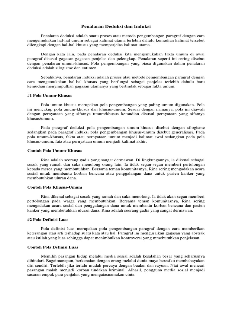 Mengonsumsi teh secara teratur dapat mencegah kanker meskipun tidak terlalu besar. Kalimat disusun mulai dari pernyataan paragraf analogi merupakan paragraf yang dikembangkan dengan pola deduksi. Pengertian deduksi deduksi berarti penarikan kesimpulan dari keadaan yang umum atau penemuan yang khusus dari yang umum. 4 metode induksi (aliran empirisme) kata empirisme berasal dari kata yunani empirikos, artinya pengalaman. Itu adalah deduksi dan induksi.